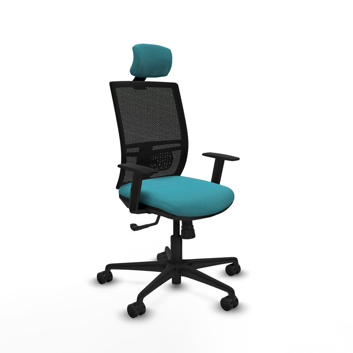 Silla de oficina Yunquera con mecanismo Sincro tapizada con Tela color Turquesa y malla color Negro. Equipada con lumbar 1D, Brazos 1D, Cabecero 1D y Ruedas 65mm nailon