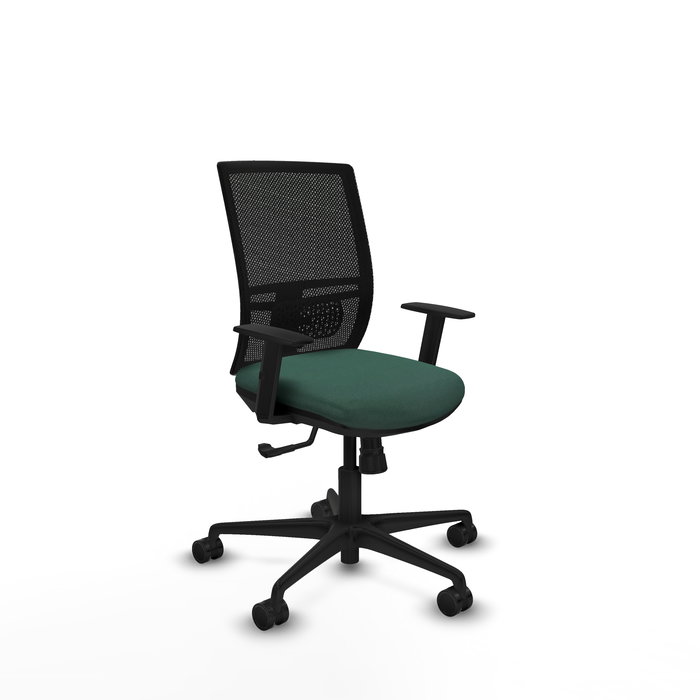 Silla de oficina Yunquera con mecanismo Sincro tapizada con Tela color Verde botella y malla color Negro. Equipada con lumbar 1D, Brazos 1D y Ruedas 65mm nailon
