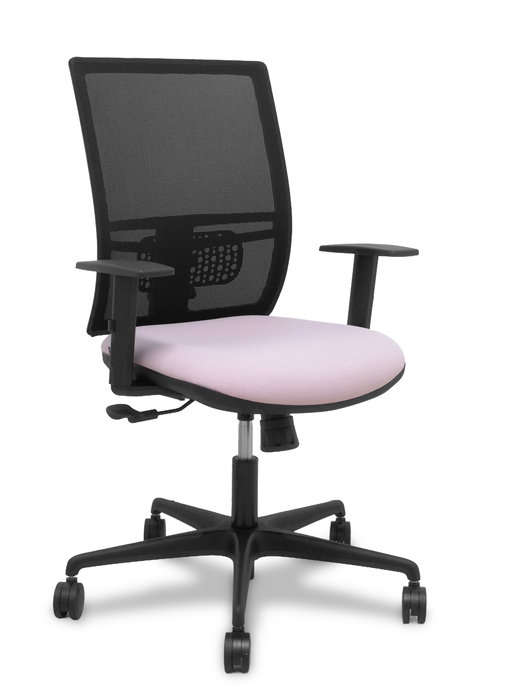 Silla de oficina Yunquera con mecanismo Sincro tapizada con Tela color Rosa y malla color Negro. Equipada con lumbar 1D, Brazos 1D y Ruedas 65mm nailon