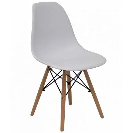 Silla fija con carcasa monobloque de PVC y patas de madera con metal.