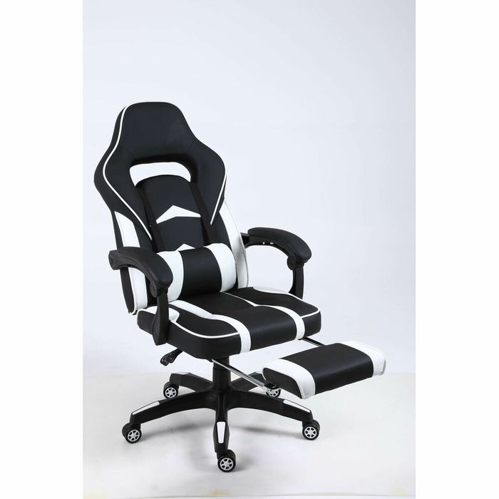 Silla gaming con mecanismo basculante, regulable en altura, brazos reclinables y reposapiés extraible. Diseño ergonómico. Se realiza la inclinación integral de 90-135 grados. Equipada con reposacabezas y almohadilla lumbar desmontable y reposapiés extraible, que le permite gozar de un confort distintivo y personalizado. Detalles técnicos Respaldo ergonómico y acolchado para una mayor adaptabilidad a la espalda Asiento ergonómico y acolchado para una mayor comodidad del usuario Asiento y respaldo tapizados en tejido SIMILPIEL color negro y blanco Relleno de alta calidad, espuma dura y cómoda Apoyo lumbar con cojín ajustable Cabecero con cojín ajustable Brazos reclinables Mecanismo basculante Regulable en altura mediante cilindro de gas Giratoria 360º Base nailon de alta resistencia Ruedas d