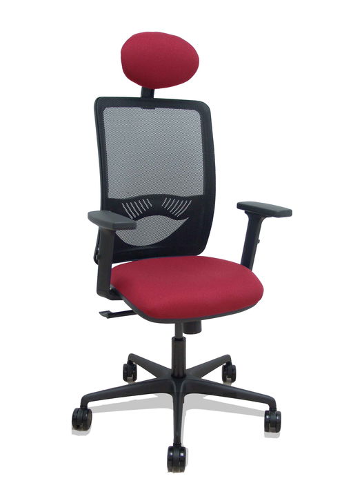 Silla de oficina Zulema con mecanismo Sincro tapizada con Tela color Granate y malla color Negro. Equipada con lumbar 1D, Brazos 2D, Cabecero Fijo y Ruedas 65mm nailon