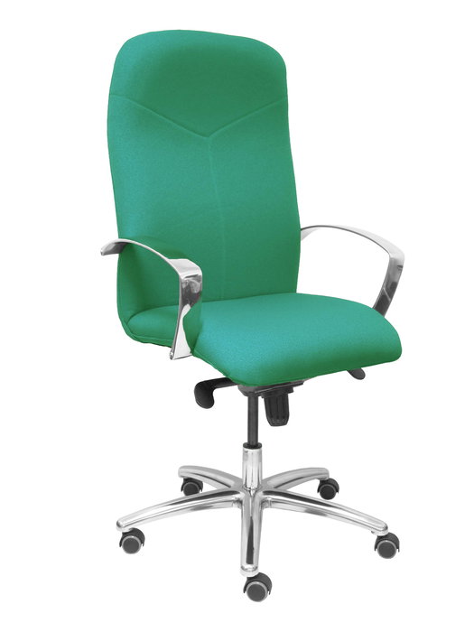 Sillón Caudete con mecanismo Basculante avanzado tapizada con Tela color Verde esmeralda. Equipado con Base aluminio, Brazos fijos y Ruedas de parqué