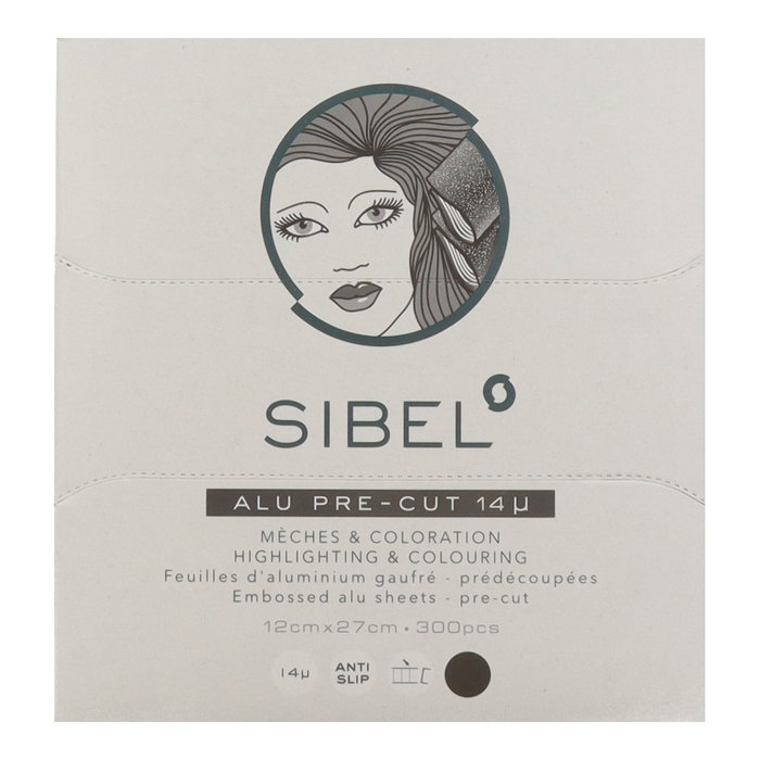 Hojas de aluminio precortadas profesionales Sibel en color negro diseñadas para facilitar servicios de mechas balayage y decoloración en peluquería profesional. Listas para usar y optimizadas para trabajos técnicos en salón.