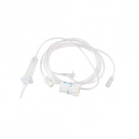 Set de infusión con regulador de flujo marca Becton Dickinson. Este producto está diseñado para administrar fluidos de forma controlada y precisa gracias a su sistema incorporado que regula el flujo.