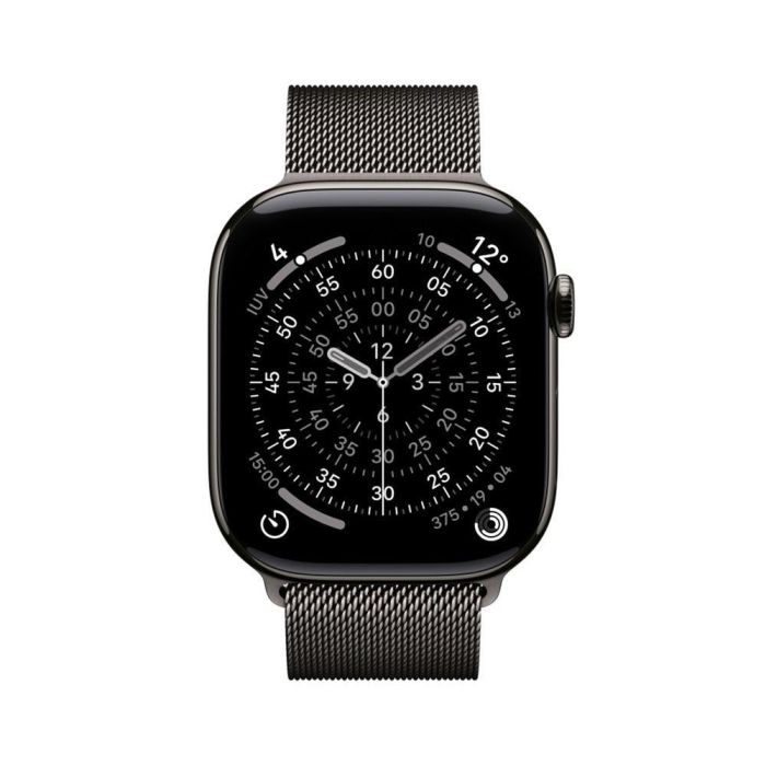 - Tamaño y peso: Alto: 46 mm, Ancho: 39 mm, Grosor: 9,7 mm, 416 x 496 píxeles, Superficie de pantalla de 1.220 mm², Peso (aluminio, GPS): 37,8 g, Peso (aluminio, GPS + Cellular): 36,9 g, Peso (titanio): 43,1 g, Para muñecas de 140 a 245 mm