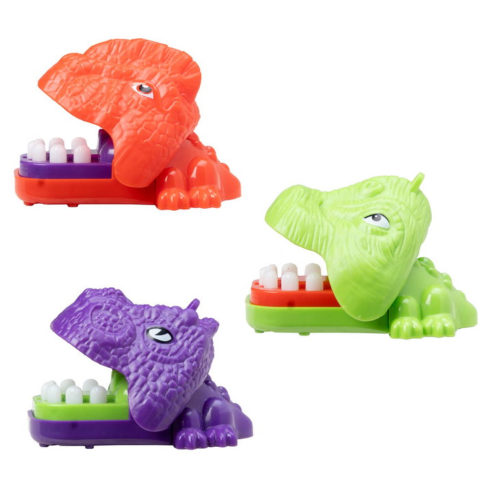 Cabeza de dinosaurio a cuerda que intentará morderte cuando la sueltes. Disponible en 3 colores diferentes.