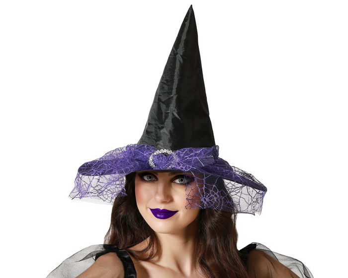 Sombrero De Bruja Negro Con Velo Púrpura Y Encaje Telaraña Para Disfraz