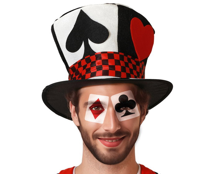 Sube la apuesta con este original sombrero de copa alta decorado con naipes y cuadros rojos. perfecto para disfraces de mago, crupier de casino o personajes extravagantes. aporta un toque teatral y misterioso a tu disfraz para carnaval, espectáculos o fiestas temáticas.