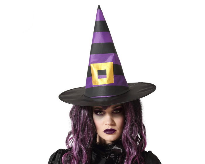 Este elegante sombrero de bruja con rayas moradas y negras es la elección ideal para destacar con estilo. la hebilla dorada central le da un toque clásico que combina perfectamente con disfraces de hechicera elegante o personajes de fantasía oscura. ideal para halloween, ferias medievales o fiestas temáticas.