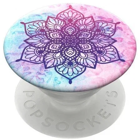 Soporte adhesivo Rainbow Nirvana de PopSockets, con diseño de mandala morado sobre viñeta pastel.DESCRIPCIÓN