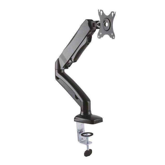 Especificaciones Soporte de mesa profesional contrapeso giratorio e inclinable para monitor/TV (3 pivotes, 1 brazo) de 13-32 Fabricado con aluminio de alta resistencia y pintado con pintura electrostática para un acabado perfecto. Se permite la instalación en la mesa a través de abrazadera o de tornillo pasante VESA Máximo: 100x100mm (Compatible con VESA de 75×75, 100x100mm) Carga Máxima: 9kg Rango de peso soportado: 2-9kgs (El peso del monitor tiene que estar dentro de este rango) Angulo de Inclinación: -45º / +90º (depende de la instalación y del espacio disponible) Angulo máximo de giro: 360º (depende de la instalación y del espacio disponible) Ángulo máximo de rotación: 180º (depende de la instalación y del espacio disponible) Brazo articulado con pistón de gas para un ajuste fácil y