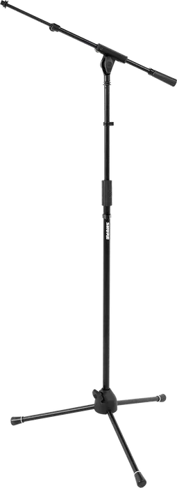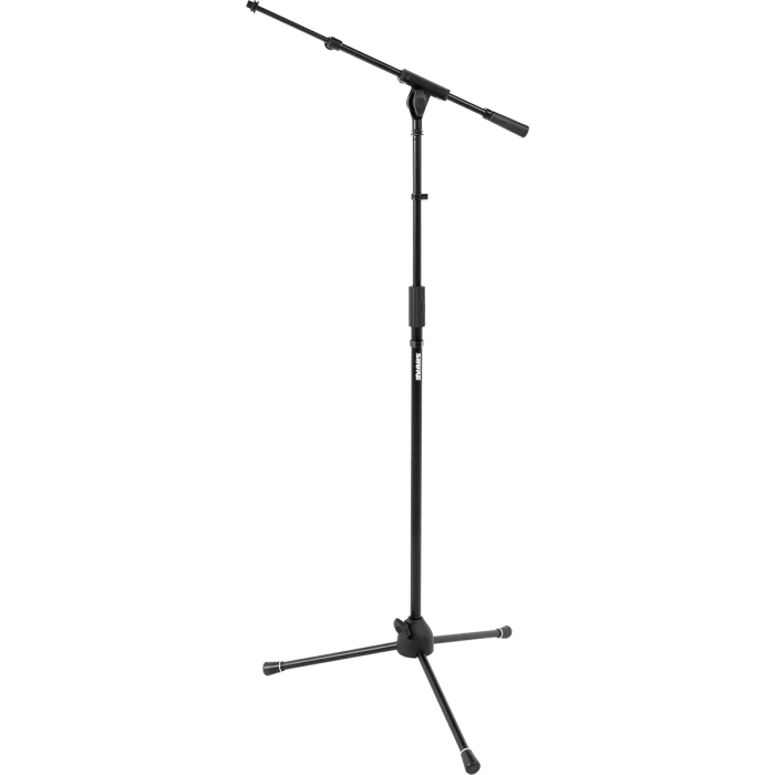 Soporte de micrófono con trípode de altura ajustable y brazo telescópico. Diseñado para usar con tu micrófono en una amplia variedad de aplicaciones. La empuñadura ergonómica permite ajustar y bloquear la altura entre 1041 y 1778 mm. El brazo telescópico amplía el alcance del micrófono para mayor flexibilidad. Trípode plegable con patas de goma antideslizantes. Tira blanca de seguridad en las patas (desmontable). Construcción en acero con recubrimiento de pintura en polvo negra. Clip integrado para mantener los cables organizados. Compatible con roscas estándar americanas y europeas. Roscado para micrófonos: US estándar 5/8"-27 (adaptador) y europeo 3/8"-16 (fijo). Peso: 2,5 kg.