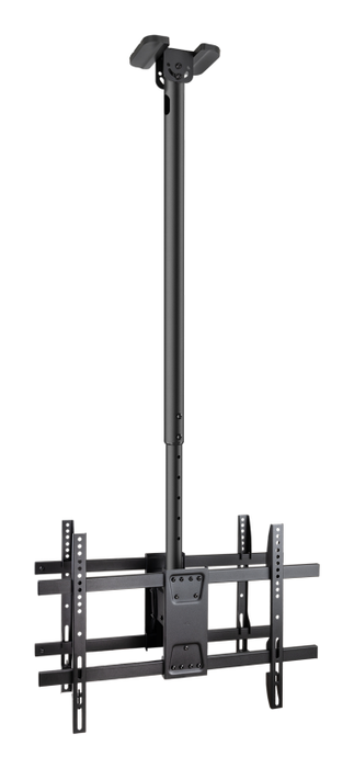TooQ Soporte de Techo para 2 Pantallas 43"-86", Negro. Capacidad máxima de peso: 100 kg, Tamaño mínimo de pantalla: 109,2 cm (43"), Tamaño máximo de pantalla: 2,18 m (86"), Compatibilidad con interfaz de montaje (min): 200 x 200 mm, Compatibilidad con interfaz de montaje (max): 600 x 400 mm. Rango de ajustes de altura: 1090 - 1690 mm, Ángulo de inclinación: -20 - 5°, Ángulo de giro (alcance): -180 - 180°. Color del producto: Negro