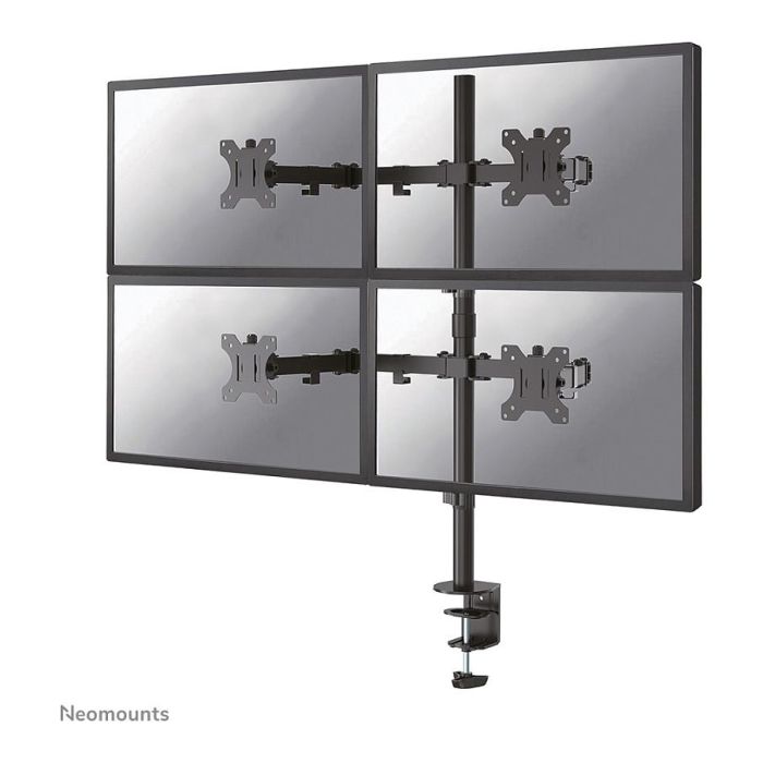 El Neomounts by Newstar FPMA-D550D4BLACK es un soporte de escritorio de movimiento completo para cuatro pantallas planas de hasta 32" con una capacidad de peso máxima de 8 kg. La tecnología versátil de inclinación (90°), rotación (360°) y giro (180°) permite que el soporte cambie a cualquier ángulo de visión para aprovechar al máximo las capacidades de la pantalla plana. Además, el soporte cuenta con ajuste de altura (0-85,7 cm) y de profundidad (0-38,2 cm), para crear la situación de trabajo perfecta. Los clips inteligentes para la gestión de los cables garantizan un enrutamiento ordenado de los mismos. Además, el soporte cuenta con un sistema VESA de fácil liberación, que le permite (des)fijar los monitores en un abrir y cerrar de ojos. El FPMA-D550D4BLACK es adecuado para pantallas que cumplen con el patrón de agujeros VESA 75x75 o 100x100mm. Los patrones de agujeros distintos se pueden cubrir utilizando una de las placas adaptadoras VESA de Neomounts by Newstar. El Neomounts by Newstar FPMA-D550D4BLACK viene con abrazadera de escritorio y arandela.