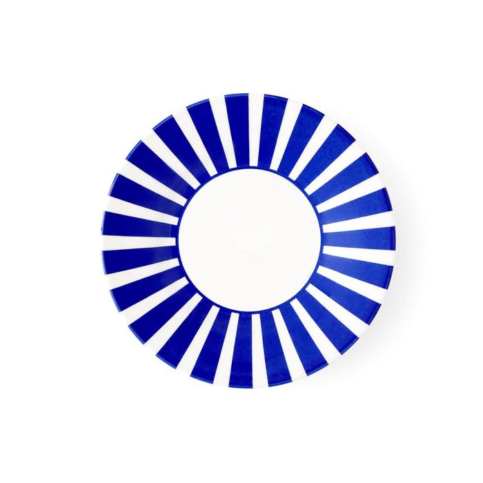 - Rayas en un fascinante tono azul cobalto siguen las suaves curvas del plato, creando un borde llamativo alrededor de su centro blanco.