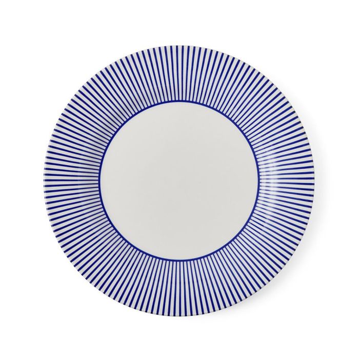 - Las llamativas rayas azul cobalto, un tono intenso sinónimo de Spode, adornan con elegancia el borde del plato y se extienden hasta encontrarse con un centro blanco impoluto.