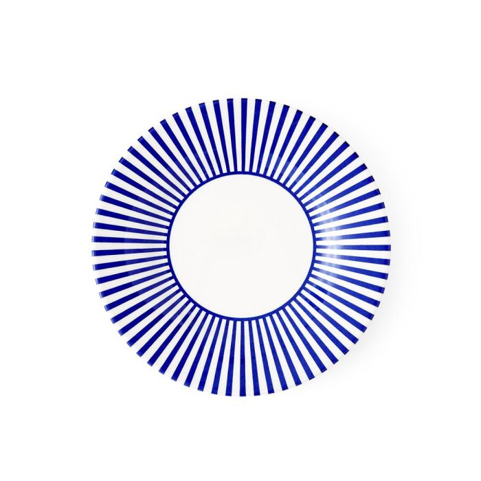 - Unas finas rayas en un fascinante tono azul cobalto siguen las suaves curvas del plato, creando un borde llamativo alrededor de su centro blanco.