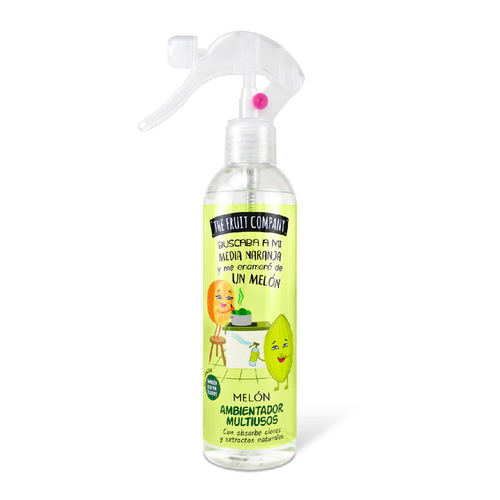 Buscabas a tu media naranja y… te encontraste con el ambientador en spray melón the fruit company con el que neutralizar cualquier mal olor al instante. desenfunda, aprieta el gatillo y, ¡pulveriza!spray ambientador de 250 ml con cítrico y frutal aroma a melón y formulado con extractos naturales. apto para tejidos, absorbe olores y… ¡no macha!ambientador en spray con pistola y base hidroalcohólica, de pulverización muy fina que permite que el aroma del ambientador se mantenga más tiempo suspendido en el ambiente ayudando así que a que el perfume se perciba por más tiempo.es un producto absorbe olores ya que está formulado con una molécula capaz de eliminar las partículas generadoras de mal olor.modo de uso: zona mascotas, baño, tejidos, tabaco y cocina.descripción olfativamelón: nota frutal melon y tropical con floral e hierba, salida cítrica y verde.