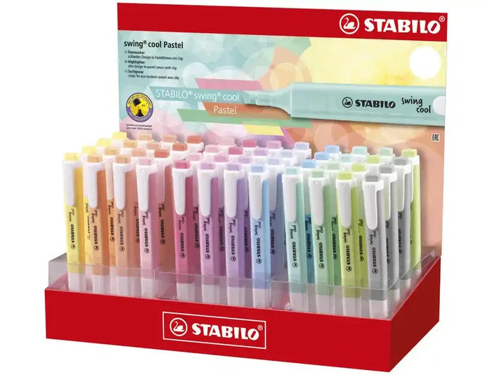 Expositor con 48 marcadores Stabilo swing cool Pastel Edition. Tecnología Stabilo Antisecado: 4 horas de proteccion antisecado para concentrarse en el trabajo. Modelo plan de bolsillo con práctico clip. 2 anchos de trazo: 1 +4 mm. Zona de agarre antideslizante. Tapón ventilado. Tinta con base acuosa. Colores pasteles que están de moda. Calidad y estilo en un solo producto.