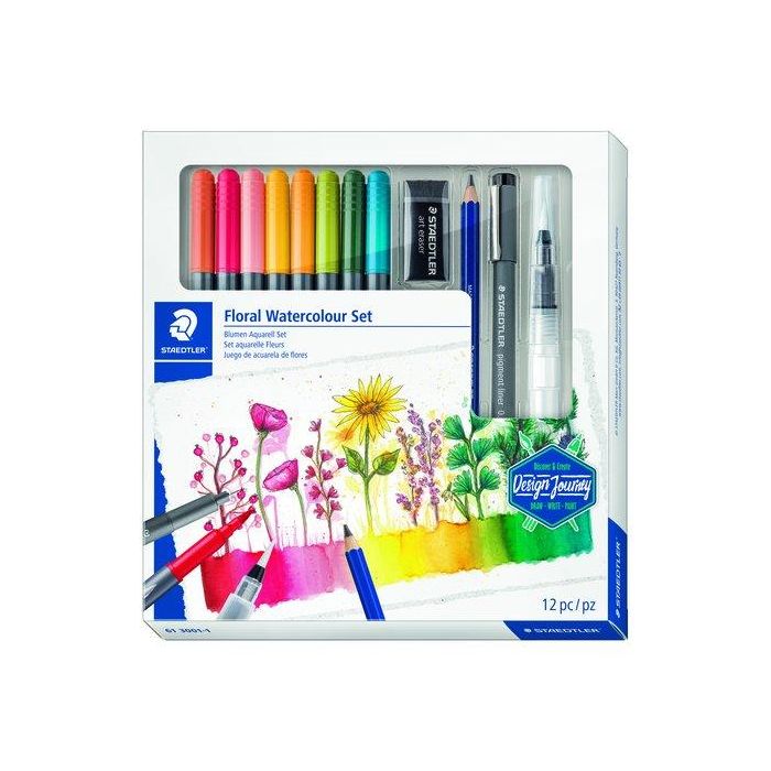 Rotulador Fibra Staedtler Floral Watercolour Set De 12 8X 3001 Rotulador Acuarelable Doble Punta 1X 308 01-9 Pigment Liner 1X 100A-4B Lumograph Aquarell 1X 949-M Pincel 1X 526 B30-9C Goma De Borrar