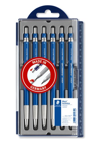 Portaminas con minas HB de 2 mm, pulsador metálico y afilaminas incorporado.