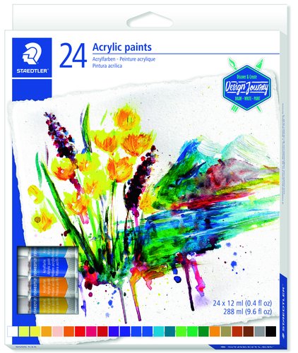 Estuche de cartón con 24 pinturas acrílicas en colores surtidos muy pigmentados y brillantes. Perfecto para usar en bellas artes y en aplicaciones artesanales, en una amplia variedad de superficies. Fácil de mezclar consiguiendo una consistencia ligera.