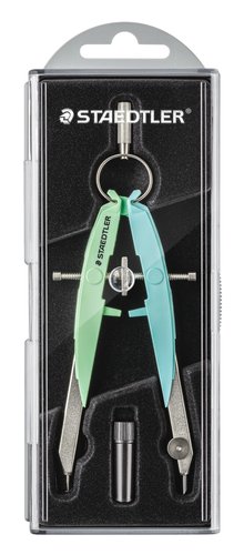 Estuche individual con compás metálico bicolor de precisión, con husillo y ajuste por rueda central, para realizar círculos de un máximo de 225 mm de diámetro. Estuche de plástico con tapa transparente con compás y tubo de piezas de recambio.