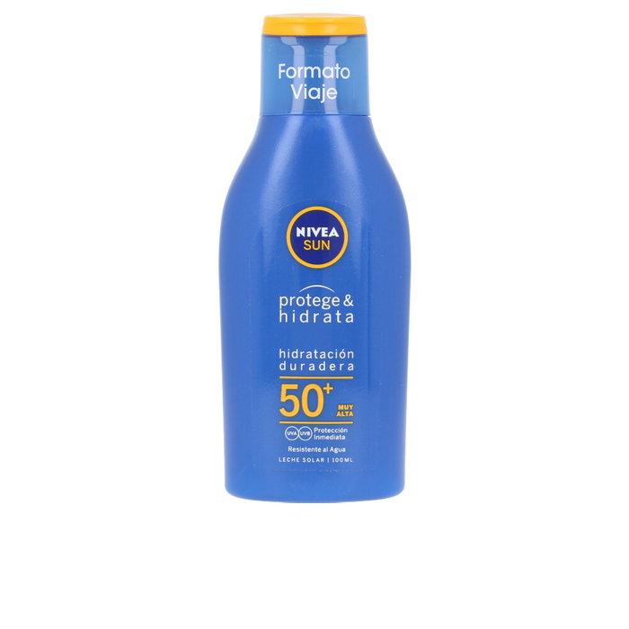 SUN PROTEGE & HIDRATA Leche SPF50+ de Nivea. Esta leche solar hidratante va un paso más allá en el cuidado de la piel bajo el sol. Su nueva fórmula no solo protege con alta eficacia contra los rayos UVA y UVB, sino que gracias a sus ingredientes (Pantenol y Glicerina) contribuye a mantener el equilibrio de los niveles de hidratación reduciendo la pérdida de agua.