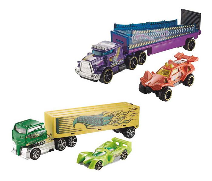 ¡Estos camiones nuevos están listos para correr! Se pueden lanzar a toda velocidad por las pistas Hot Wheels. ¡Las cabinas y los remolques de los camiones se pueden intercambiar! Cada camión incluye un coche.