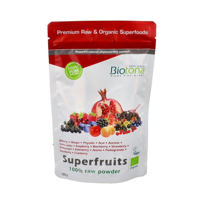 Indicaciones: Biotona bio Superfruits Raw es un polvo superpotente a base frutas. Este producto contiene fresa, açaí, aronia, mirtilo, mora, arándano rojo, frambuesa, granada, maqui, baya de los Incas, grosella, saúco y cassis, así como polvo de acerola y camu camu. Todas las bayas de esta mezcla proceden al 100% de la agricultura biológica, han sido sometidas a una estricta selección y reducidas a polvo por un procedimiento de liofilización que salvaguarda el sabor, olor y color de la fruta fresca, conservando sus sustancias nutritivas y fitonutrientes naturalmente presentes en ella.