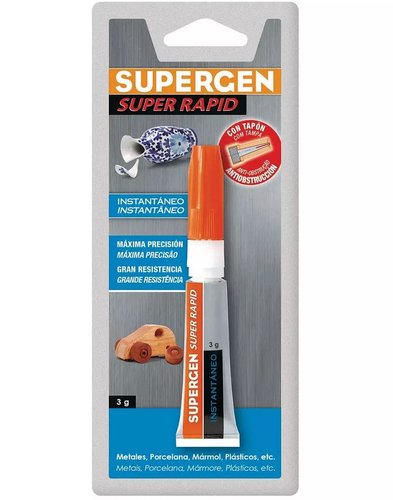 Supergen adhesivo instantáneo transparente. Pega en pocos segundos con la máxima fuerza de unión. Apto para: metales, porcelana, mármol, plásticos, goma, vidrio, caucho, madera, cuero, etc. No apto para polietileno, polipropileno, PTFE ni silicona.