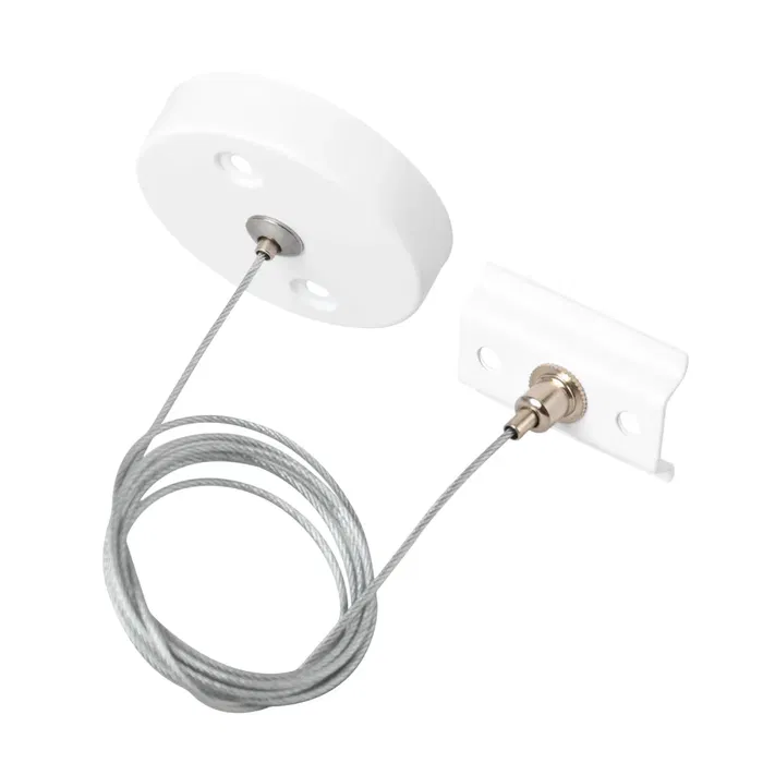 El Kit de Suspensión para Carril Monofásico permite instalar los carriles a cierta distancia del techo. Cada Kit está compuesto por un cable de acero de 1metro de longitud, un enganche de carril y un enganche de techo. Con estos kits se pueden mantener los sistemas de carriles en suspensión, a una altura regulable. Esto permite una gran variedad de opciones en la elevación de las luminarias, que posibilita la creación de distintos ambientes muy originales y exclusivos. Para anclar cada tramo de carril al techo mediante este sistema, necesitamos dos kits. De modo que colocaremos cada uno en las proximidades del extremo del carril.