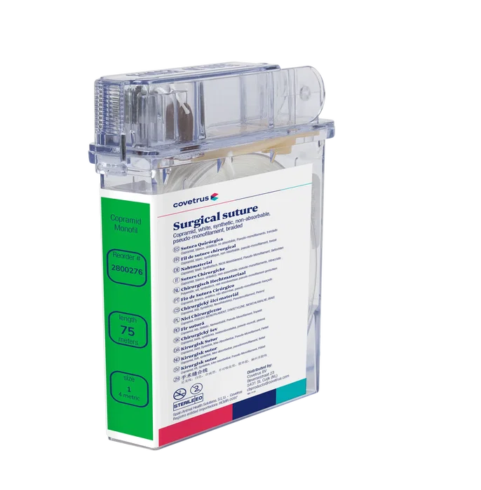 Copramid (Supramid) de Covetrus es un material de sutura estéril trenzado, no absorbible, diseñado para aplicaciones quirúrgicas. Está fabricado a partir de polímeros alifáticos de cadena larga (nylon 6 o nylon 6/6), en su presentación de pseudomonofilamento. Los hilos de monofilamento de Copramid (Supramid) son de color blanco, sin teñir.