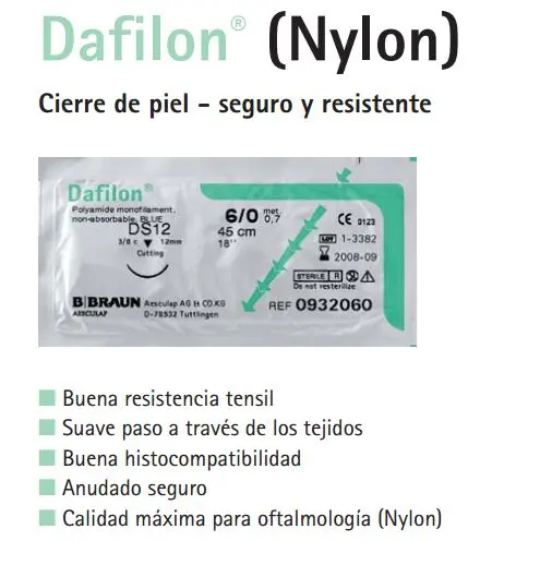 Dafilon Nylon Blue de B. Braun es una sutura quirúrgica monofilar de poliamida 6, no absorbible y de color azul. Ofrece una excelente histocompatibilidad y un paso suave a través de los tejidos. Proporciona una buena tensión del nudo y una sujeción segura del mismo.
