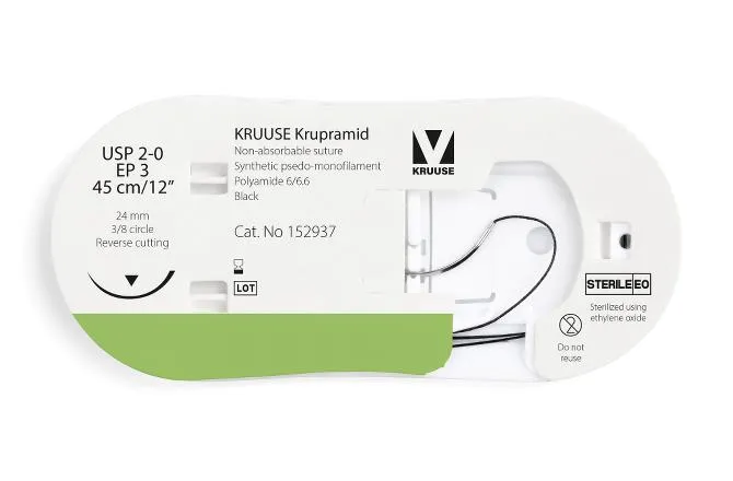 Sutura Krupamid 2-0. Longitud de 45 cm. Color Negro. Tamaño de la aguja de 24 mm. De 3/8 de círculo (3-8 Rc). Paquete con 12 Unidades. Marca Kruuse.