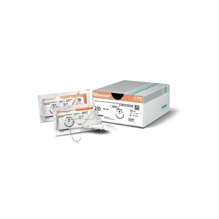La Sutura Monosyn Undyed 4-0 DS12 RCP de B. Braun es una sutura quirúrgica monofilamento, absorbible y sintética, teñida de color violeta para una mejor visibilidad. Su calibre es 4-0 y su longitud es de 70 cm. La aguja utilizada es la DS12, con un tamaño de 3/8 de círculo y una longitud de 12 mm, diseñada para una penetración suave y precisa.