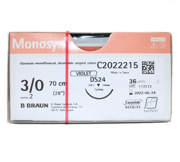 La sutura quirúrgica Monosyn Violet 3-0 de B. Braun es un producto esencial para procedimientos médicos que requieren una sutura absorbible. Este paquete contiene 36 unidades individuales, cada una con una longitud útil de 70 cm y un tamaño de aguda DS24. Fabricada con tecnología de monofilamento sintético absorbible, la sutura Monosyn ofrece una alta resistencia inicial, una excelente manejabilidad y una reacción tisular mínima. El color violeta facilita su identificación durante el procedimiento. Ideal para una amplia gama de aplicaciones en cirugía general, plástica y cardiovascular donde se requiere una sutura fiable y de alta calidad.