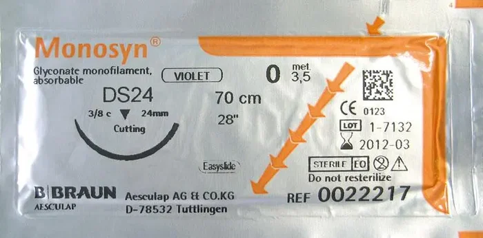 Monosyn® es una sutura sintética absorbible a medio plazo, de gliconato (copolímero del ácido glicólico (72%), ?-caprolactona (14%) y trimetilen carbonato(14%)), monofilar. Se absorbe por hidrólisis sin crear reacción inflamatoria, no variando ni por el estado del enfermo, ni del plano, ni por la aplicación postoperatoria de radiaciones. Está disponible en color violeta e incolora.