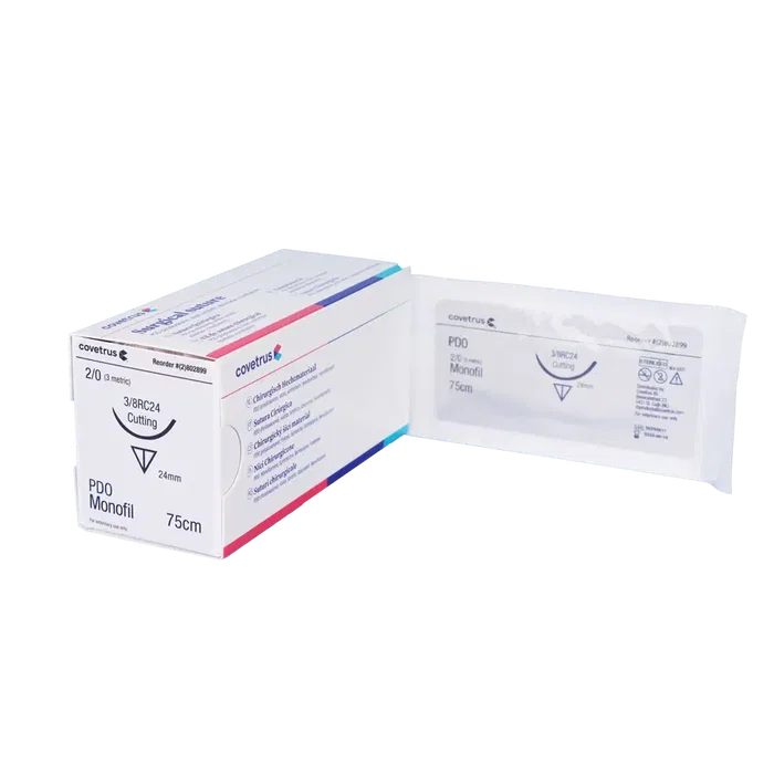 Suturas Pdo Violet de 1-2Tp48 con una longitud de 75 cm. Presentadas en un paquete de 12 unidades. Marca Covetrus. Producto ideal para uso profesional.