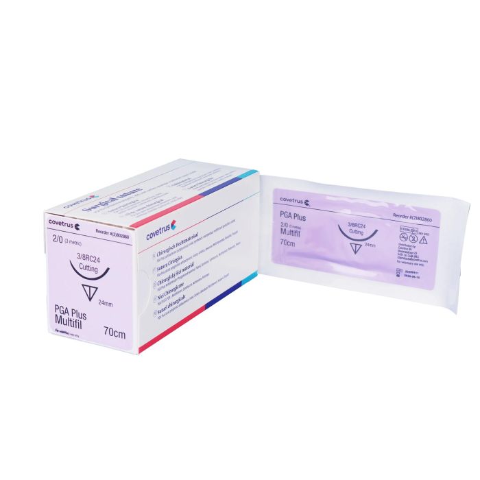 La Sutura PGA Plus de Covetrus es un material de sutura absorbible, sintético, trenzado y recubierto, diseñado para una amplia gama de aplicaciones quirúrgicas. Cada unidad cuenta con una longitud de 70 cm y un tamaño de 3/0, junto con una aguja 3/8 RC24, lo que garantiza precisión y seguridad en su manejo. El paquete incluye 12 unidades, ofreciendo una excelente relación calidad-precio y conveniencia para el profesional médico.