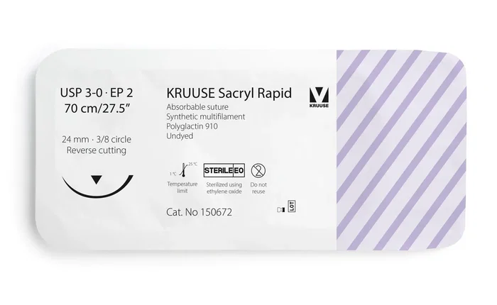 Sutura de Kruuse diseñada para tejidos de rápida cicatrización como la mucosa oral y encías, o en zonas donde no se requiere un soporte tisular prolongado por más de 7 días. Fabricada según los estándares USP 3-0 y EP 2. Incluye aguja de 3/8 de círculo con corte inverso de 24 mm de longitud. La sutura tiene una longitud total de 70 cm (27.5 pulgadas) y es de color sin teñir. Se presenta en un práctico paquete con 12 unidades. La vida útil del producto es de 3 años a partir de su fecha de producción.
