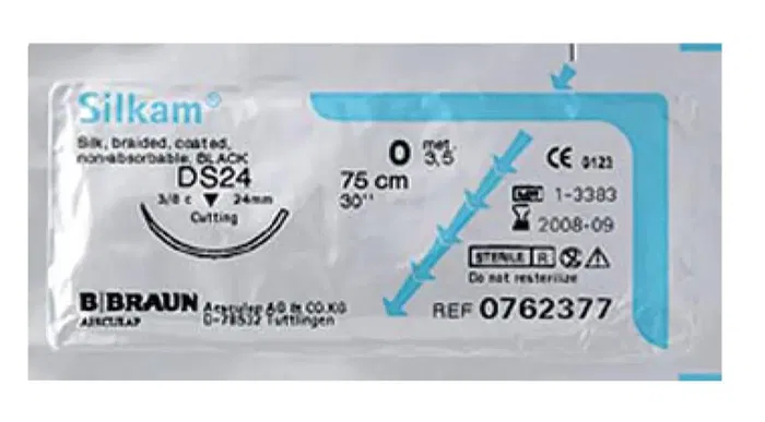Sutura Silkam Black 2 Hs30 75 cm 36Ud de B. Braun. Es un hilo quirúrgico de seda, negro, calibre 2, con aguja HS30 de 75 centímetros de longitud. El paquete contiene 36 unidades.