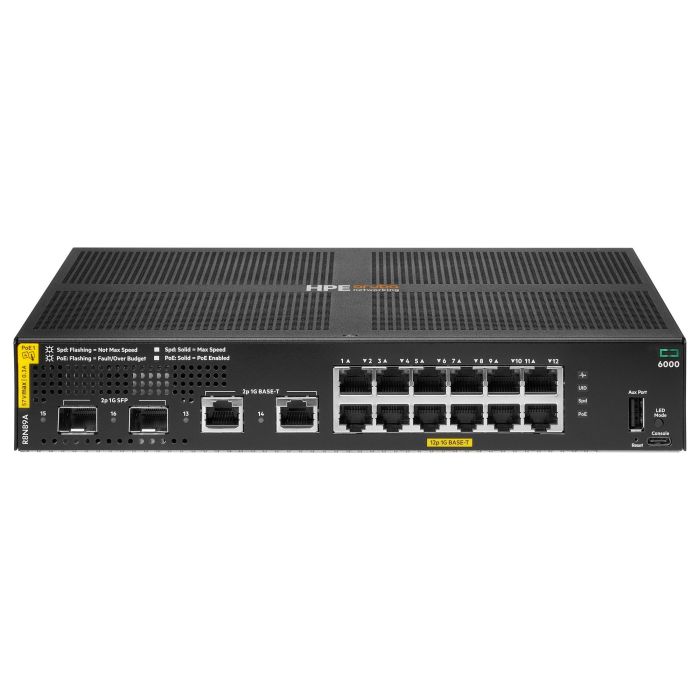 HPE Aruba Networking CX 6000 12G Class4 PoE 2G/2SFP 139W Switch, Gestionado, L3, Gigabit Ethernet (10/100/1000), Energía sobre Ethernet (PoE), Montaje en rack, 1U