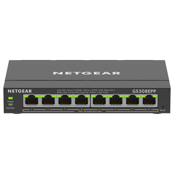 NETGEAR 8-Port Gigabit Ethernet High-Power PoE+ Plus Switch (GS308EPP), Gestionado, L2/L3, Gigabit Ethernet (10/100/1000), Bidireccional completo (Full duplex), Energía sobre Ethernet (PoE)