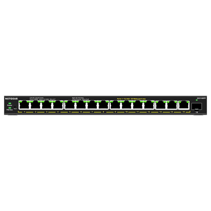 NETGEAR 16-Port High-Power PoE+ Gigabit Ethernet Plus Switch (231W) with 1 SFP port (GS316EPP), Gestionado, Gigabit Ethernet (10/100/1000), Bidireccional completo (Full duplex), Energía sobre Ethernet (PoE)