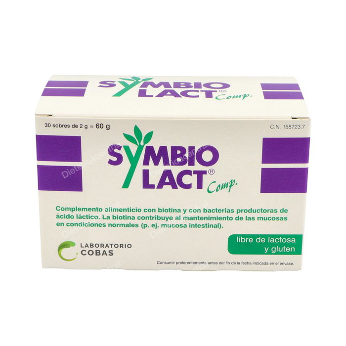 Indicaciones: Symbiolact es un suplemento nutricional que incluye biotina y diversas cepas de bacterias productoras de ácido láctico. Las bacterias en symbiolact comp están congeladas y se activan y multiplican al entrar en contacto con agua. Además de las bacterias lácticas, el suplemento incluye la vitamina hidrosoluble biotina (30 µg por sobre), que tiene un papel importante en el metabolismo celular. La biotina es esencial para los tejidos con un alto metabolismo, como las mucosas. La mucosa intestinal, que es la superficie mucosa más grande del cuerpo y se renueva completamente cada 2-3 días, requiere biotina para mantener su actividad metabólica. La mayor parte de la biotina necesaria se obtiene a través de la dieta, mientras que la microbiota intestinal produce pequeñas cantidades adicionales. En algunos casos, como cuando se toman antibióticos, los requerimientos de biotina pueden aumentar. La biotina ayuda a mantener las mucosas y la piel en buen estado, y contribuye al metabolismo energético y al funcionamiento normal del sistema nervioso. Además, symbiolact 30 sobres cobas es sin lactosa y sin gluten.