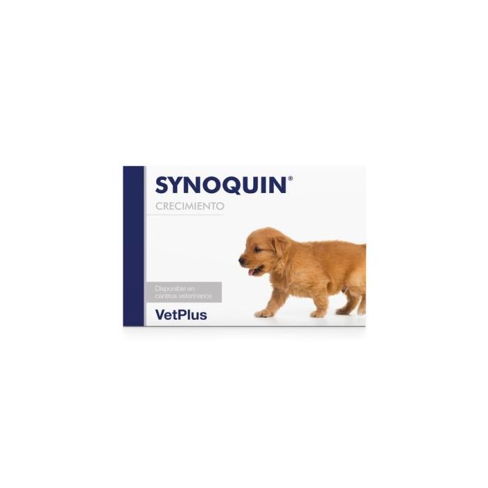 - MUCHAS RAZAS DE PERROS TIENEN PREDISPOSICIÓN A SUFRIR DAÑOS ARTICULARES DURANTE LA FASE DE CRECIMIENTO, YA SEA A CAUSA DE SU CONSTITUCIÓN GENÉTICA O DEL GRAN AUMENTO DE PESO QUE EXPERIMENTAN EN ESA ETAPA. COMPOSICION Cada comprimido contiene: Condroit¡n sulfato (95 %) 100 mg. Hidrocloruro de glucosamina (99 %) 125 mg. NacetilDglucosamina (99 %) 15 mg. Ácido ascórbico 12 mg. Sulfato de zinc 10 mg. INDICACIONES Complemento dietético condroprotector indicado para perros expuestos a situaciones que pueden desembocar en el deterioro de las articulaciones o en lesiones articulares. POSOLOGIA Pauta inicial: de 3 a 24 meses de edad 2 comprimidos/1 por la mañana y 1 por la noche. Junto con las comidas diarias del animal. En cuanto el perro tenga dos años, quizás sea conveniente continuar la administración de un complemento. Llegados a este punto, deber¡a pasar a emplearse Synoquin Adultos.