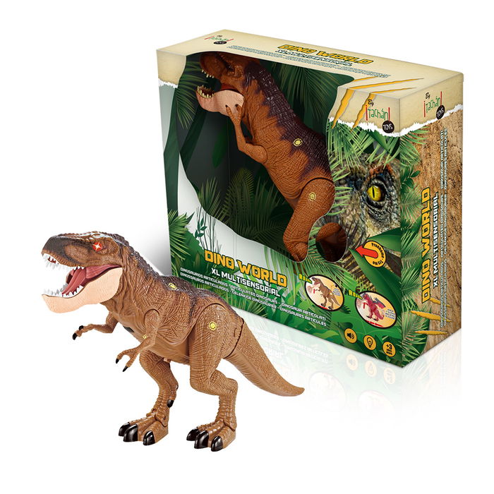 Dinosaurio XL sensorial con multitud de funciones. Es de tamaño XL. Estética y color muy realista. Se iluminan los ojos, gruñe, anda, mueve la cabeza, ETD... Es una pieza espectacular debido a que tiene todas las acciones en un mismo modelo. No recomendado para menores de 3 años.