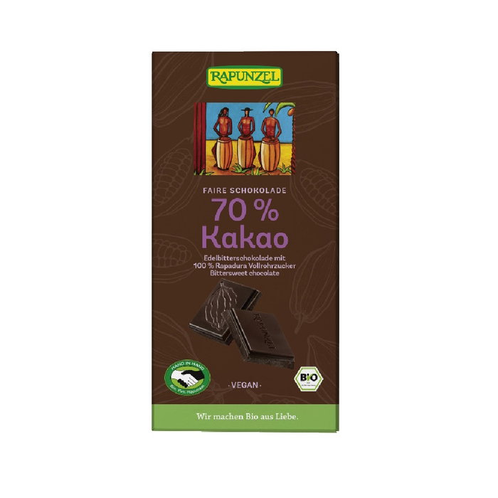 tableta de chocolate extra negro 70%. Con azúcar de caña Rapadura y auténtica vainilla Bourbon. Elaborado según la tradición suiza con ingredientes de cultivo biológico y comercio justo (Hand and Hand). El intenso conchado desarrolla la riqueza de los aromas del cacao y su fina textura.